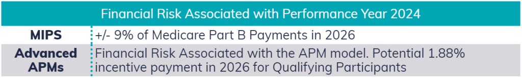 MIPS uses an array of metrics to adjust payments, whereas financial risk and performance assessment under APMs depend on the model chosen. MIPS payment adjustments and the APM incentive are based on performance two years prior to the payment year – that is, performance in 2024 will determine payments in 2026.
