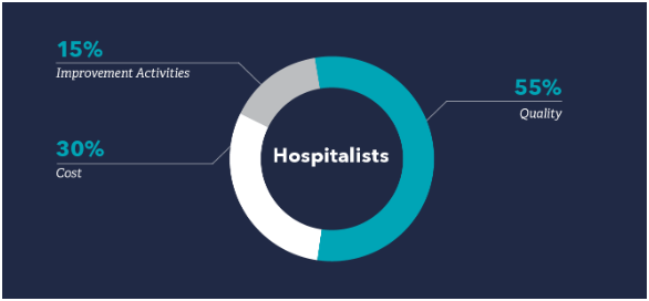 The weighting for each of the four MIPS categories – Quality, Cost, Promoting Interoperability, and Improvement Activities – in 2024 are below. Note that hospitalists’ weighting typically differs from the average MIPS clinician due to an exemption from Promoting Interoperability.
